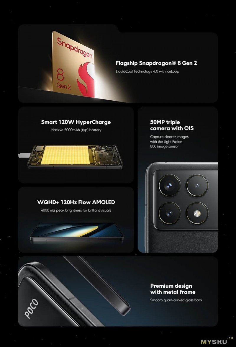 Процессор Snapdragon 8 Gen 2. Экран 6,67-дюймовый WQHD+ 120 Гц Flow AMOLED DotDisplay, частота обновления до 120 Гц. Аккумулятор 5000 мАч, 120 Вт быстрое зарядное устройство. Камера с оптической стабилизацией 50 Мп + 8 Мп + 2 Мп, 16 Мп фронтальная камера.