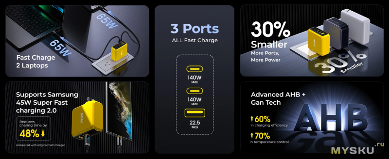 Большая зарядка из желтого пластика с евровилкой на три порта: 2x Type-C — 140 Вт, 1x USB-A — 22.5 Вт с поддержкой PD3.1, Power Factor Correction + Asymmetrical Half-Bridge.