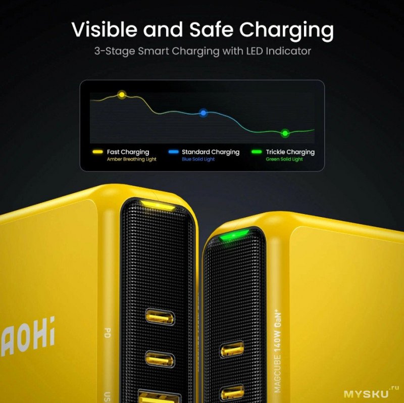 Устройство со световой индикацией. AOHI — первый и единственный бренд с трехцветной подсветкой, благодаря которому зарядное устройство USB четко показывает состояние интеллектуальной зарядки. Янтарный дышащий свет указывает на режим быстрой зарядки, синий сплошной свет указывает на стандартный режим зарядки, а сплошной зеленый свет указывает на режим подзарядки. Это делает процесс зарядки более заметным, автоматически переключая режим зарядки и интеллектуально регулируя зарядный ток для различных устройств, обеспечивая более быструю и безопасную зарядку.
