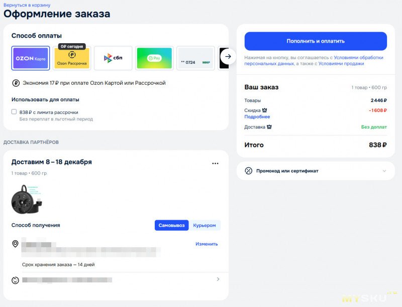 Для заказа необходимо воспользоваться опцией оплаты «Карта Ozon», в этом случае стоимость составит 838₽, никакого дополнительного купона применять не требуется.