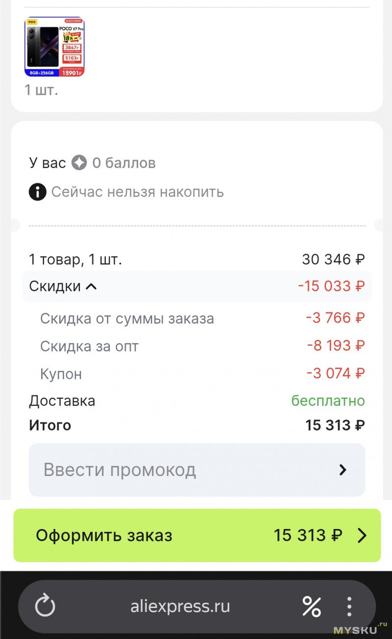 Смартфон POCO X7 Pro с учётом скидки от суммы заказа в размере 3766 руб., скидки за опт (можно купить 1 единицу) в 8193 руб. и купона магазина в размере 3074 руб. стоит 15313 руб. за версию 8/256 ГБ.суммарная скидка относительно начальной цены смартыона составлет 50%.