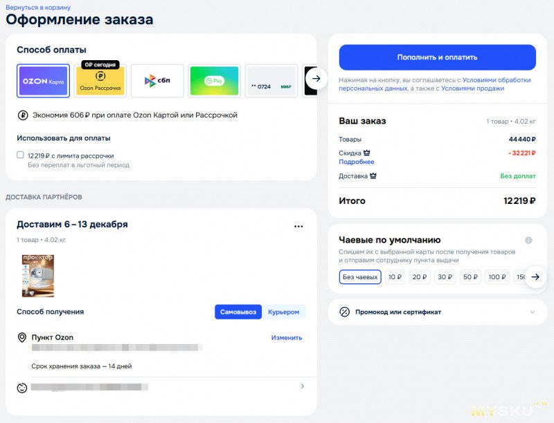 Для заказа необходимо воспользоваться опцией оплаты «Карта Ozon», в этом случае стоимость составит 12219₽, никакого дополнительного купона применять не требуется.