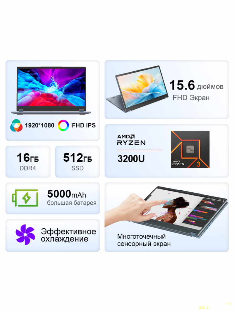 Бюджетный ноут (экран 15.6″, ЦП Ryzen 3 3200U, 16/512 ГБ) с сенсорным экраном, который можно использовать как большой планшет. 2 года гарантии.
