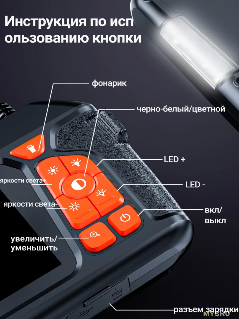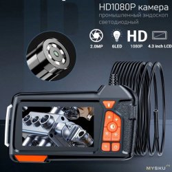 Бюджетный эндоскоп с экраном 4,3 дюйма на корпусе, камера (диаметр 5,5 мм) на кабеле 2 метра, подсветка, защита IP67, аккумулятор 2000 мАч на 3 часа работы. Фокусное расстояние камеры 2-10 см.