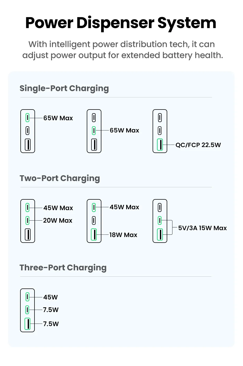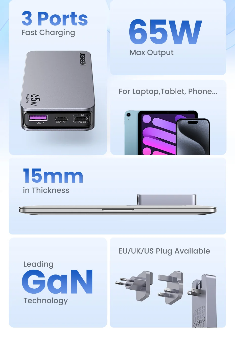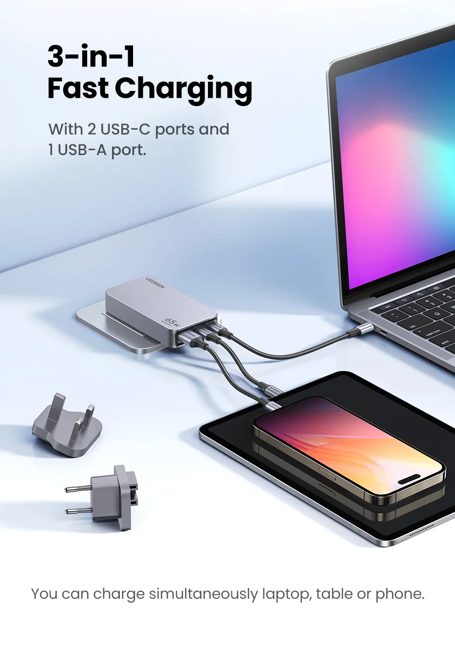 Компактная портативная зарядка на 3 порта. Максимальная выходная мощность до 65 Вт. Поддерживаются быстрые протоколы. Сменные разъемы для подключения к различным типам розеток.