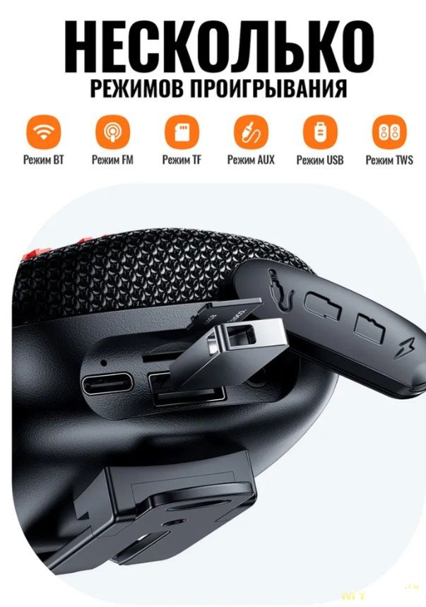 Колонка оснащена 45-миллиметровым динамиком мощностью 5 Вт, который обеспечивает чистый и качественный звук. Она поддерживает несколько способов воспроизведения музыки: Bluetooth, FM-радио, карты памяти TF, USB-флешки и AUX-вход.