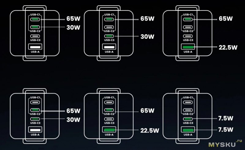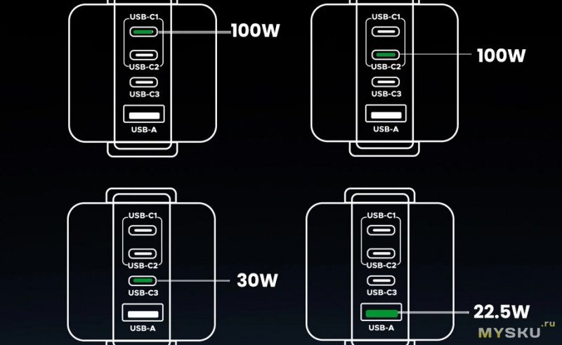 Общая мощность: 100 Вт (при одновременной зарядке распределяется)