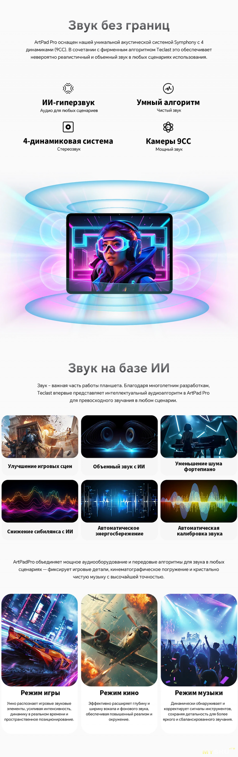 Качественная аудиосистема: четырёхканальные динамики с технологией AI Hyper Audio и алгоритмом ArtTune.