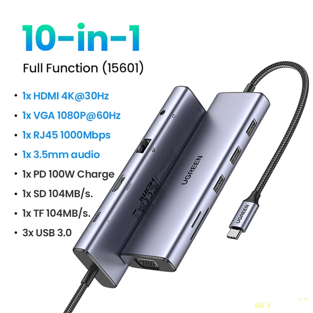 Новогодняя акция от UGREEN на USB-хаб формата 10-в-1 с поддержкой двух мониторов 4K HDMI, а также 1080P VGA. Плюс порты — Gigabit Ethernet, порт зарядки USB-C 100 Вт PD, 3 порта USB-A 3.0, аудиоразъем 3.5 мм и устройство чтения карт SD TF.