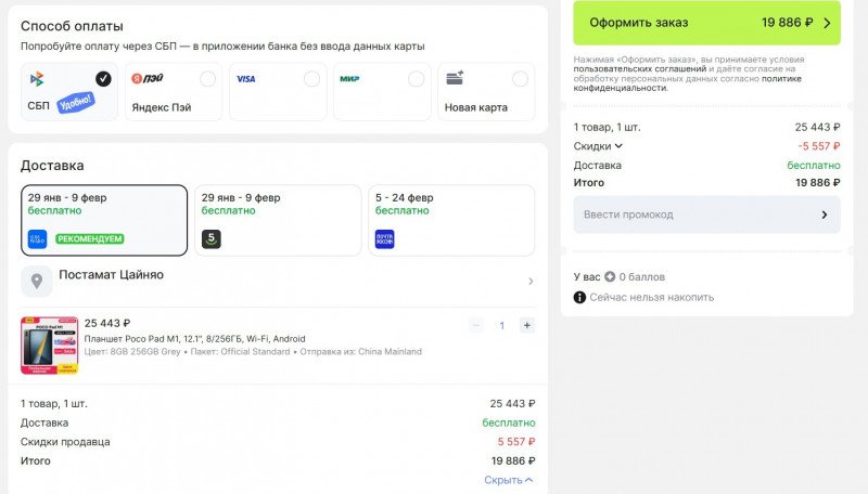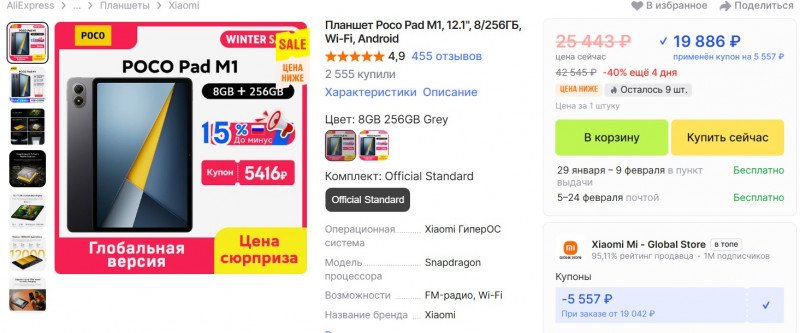 Скидка по купону 5 557 рублей, планшет обойдется в 19 886 рублей.