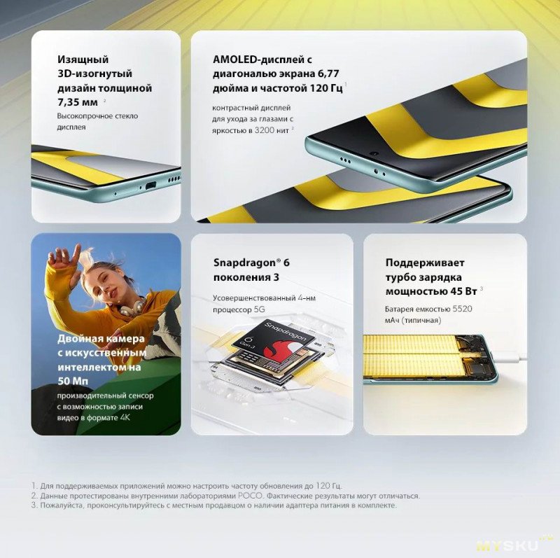 Разрешение экрана: 2392x1080. Частота обновления: 120 Гц. 50 МП основная камера, 2 МП камера глубины, 20 МП фронтальная камера. Встроенный сканер отпечатков пальцев, разблокировка по лицу с помощью ИИ, работает на Xiaomi HyperOS 2. NFC, Wi-Fi, Bluetooth 5.1, Dolby Atmos.