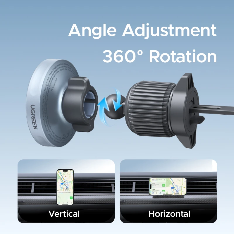 Серия UGREEN MagFlow Qi2 (25 Вт) W758-55967 магнитная зарядка для автомобиля, обеспечивает беспроводную зарядку мощность до 25 Вт. Они поддерживают стандарт Qi2, оснащены технологией ThermalGuard™ для контроля температуры. Выдерживает вес до 1600 г.