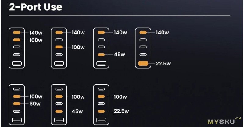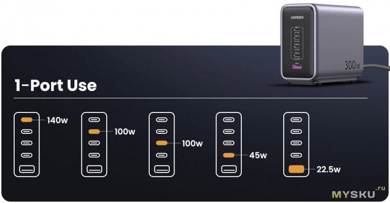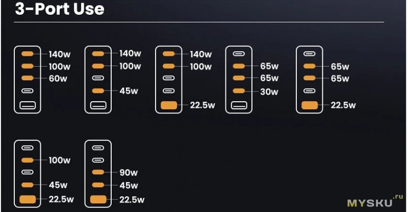 Может выдавать 140+100+60Вт одновременно (на три порта) и много других комбинаций, в общей сложности до 300Вт.