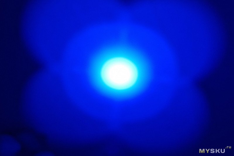 Работает только на УФ 365 нм (+ стекло Вуда). Питание с аккумулятором формата 21700 (5000 мАч). Новинка построена на 4-х светодиодах LUMINUS SST-08-UV, и выдает до 6 Вт оптической мощности в УФ диапазоне, чего хватит и для полупрофессионального применения (а на коже оставляет ожоги).
