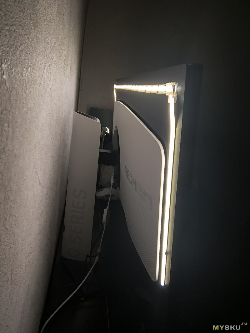 И, кстати, монитор она все же засвечивает немного, а если направить, чтобы точно не засвечивала-то неприятно лупит в глаза, в общем для себя такой тип подсветки исключил, вернулся к обычной лампе настольной