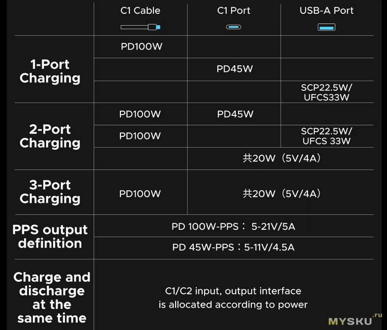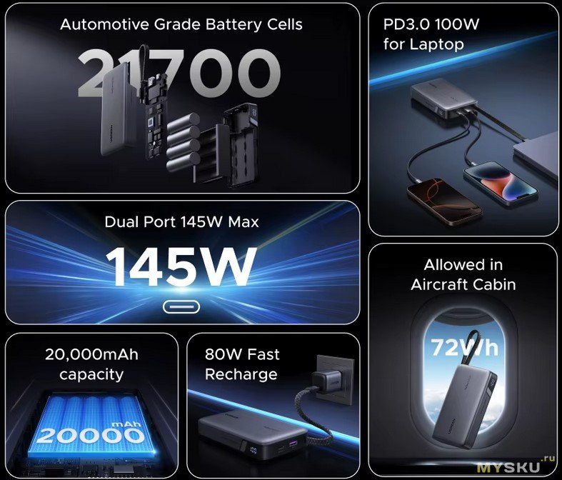 Встроенный кабель. Ячейки 21700. До 100Вт на один порт на выход и 80Вт на вход.