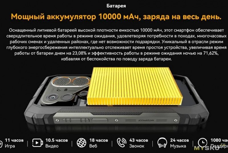 - 10 000 мАч (до 45 дней в режиме ожидания) + реверсивная зарядка других устройств.