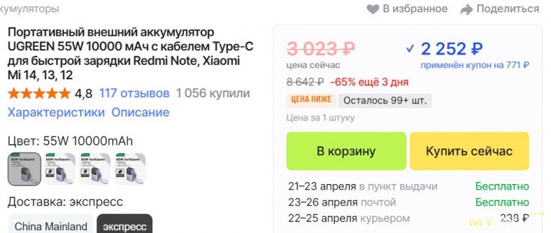 Этого малыша недавно обозревал. Он настолько хорош, что стал моим основным. Сделан на базе элементов 21700, может выдавать 55Вт. Встроенный кабель. Сейчас чуть снизили цену, плюс действуют коды и купоны. У меня в корзине применяются код на -8$, купон на -4$ и монетки на -0.92$. Итого ценник 33.21$. Для покупателей из РФ цена ещё чуть ниже.