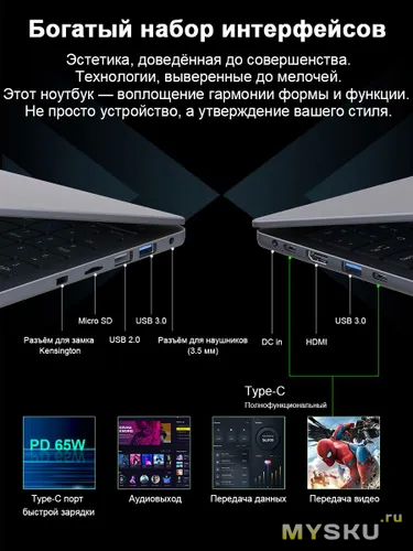 - Интерфейсы: 2 шт. полнофункциональный USB-C 3.0, 2 шт. USB-A 3.0, 1 шт. USB-C 2.0, 1 шт. HDMI 1.4 (4K@60 Гц), 3,5 мм (микрофон и наушники), 1 шт. TF-слот