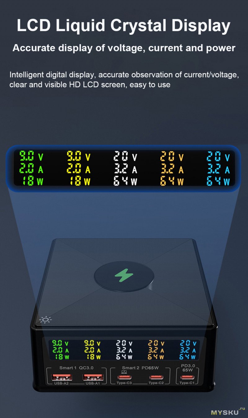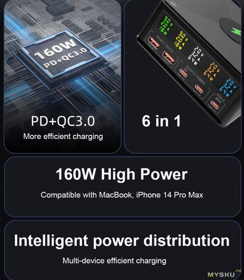 Пять портов (2хUSB-A, 3xType-C), мощность 160 ВТ, до 65 Вт на один порт, беспроводная зарядка, дисплей.