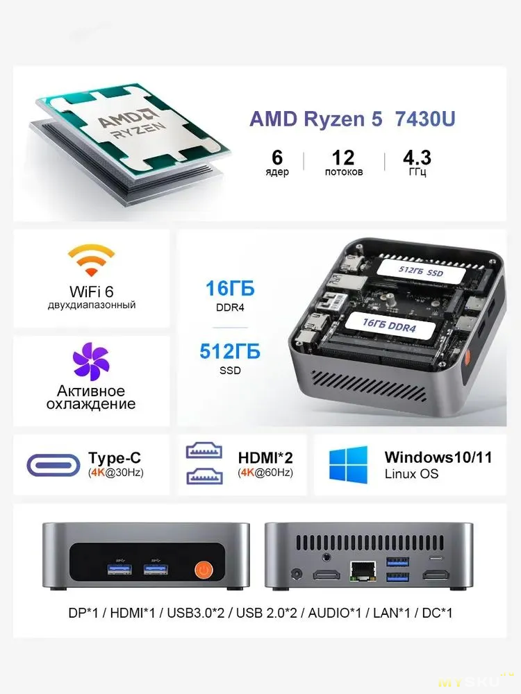 Офисный мини-ПК с 16 ГБ ОЗУ DDR4 и 512 ГБ SSD, год гарантия (локальная в РФ). Вывод видео на три монитора, металлический корпус 116*107*36 мм.