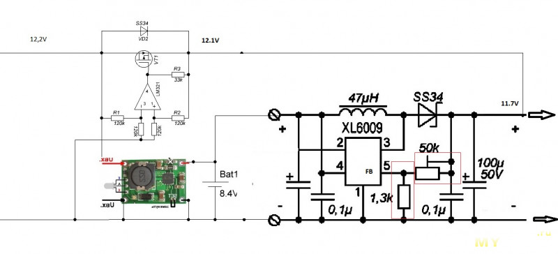 Принцип работи- 12.2 вольт идет черед идеальный диод в нагрузку без потерь + идет зарядка АКБ, преобразователь настроен с 8.4 повышать до 11.7, есть свет на виходе 12.1, преобразователь отключен, свет пропал напряжения на выходе упало менее 11.7 включился преобразователь.