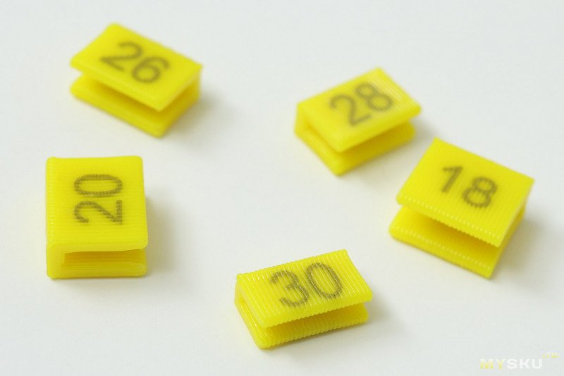 При реальном использовании катушек оказалось, что мелкие фиксаторы провода из бесцветного пластика постоянно «теряются» на столе, а то и под ним. А когда находятся, то сразу непонятно, на какой провод тот или иной фиксатор. Поэтому перепроектировал их покрупнее и перепечатал из более заметного и флуоресцентного пластика, чтобы если что, УФ фонариком «искать», ну и сделал на них маркировку: