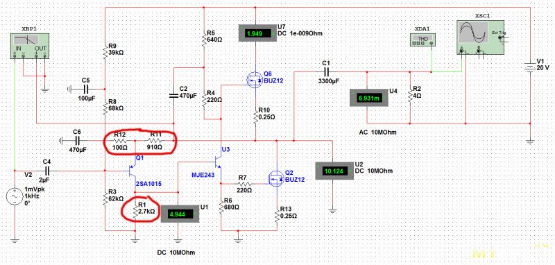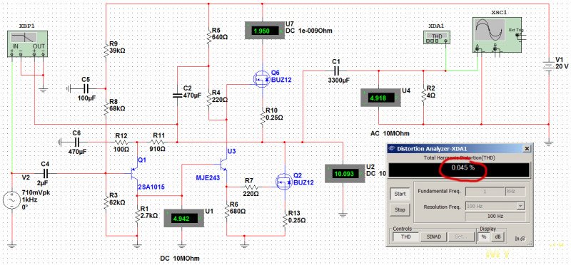 Симулятор предсказал THD=0,12% (5V RMS на нагрузку 4 Ом) и частоту 1,15 МГц (-3дБ):