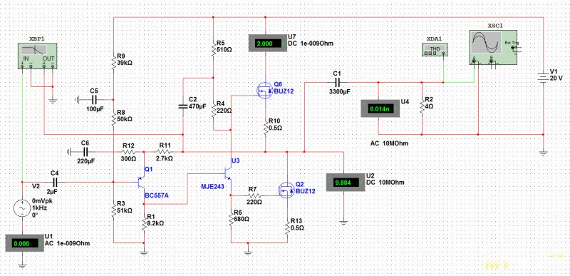 Режим выходного каскада по постоянке здесь и далее одинаковый 20В 2А.