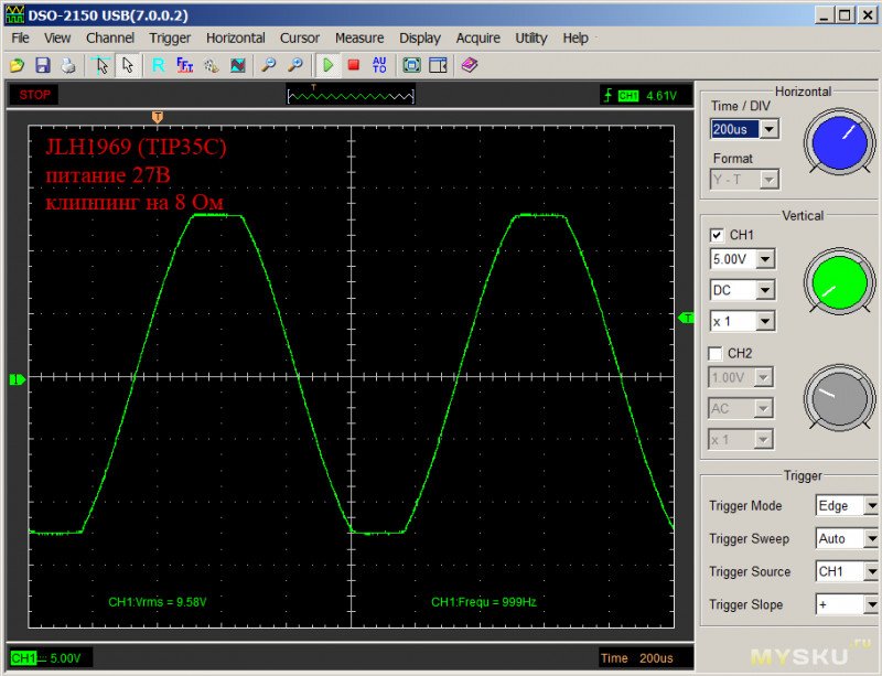 Т.е. усилитель честно выдаёт 10 Вт на канал при нагрузке 8 Ом.Скорость нарастания — 20 В/мкс: