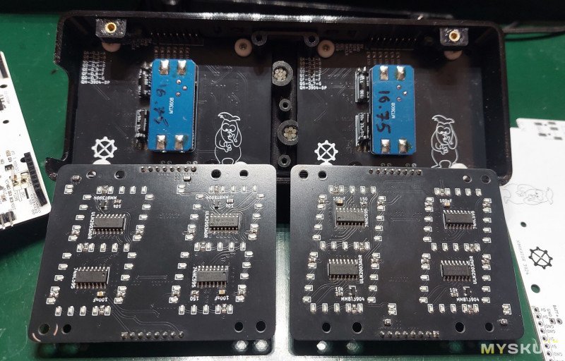 Временно прикручиваем платы на переднюю часть корпуса короткими винтами M3x6 и соединяем их короткими проводами. Должно получиться как-то так: