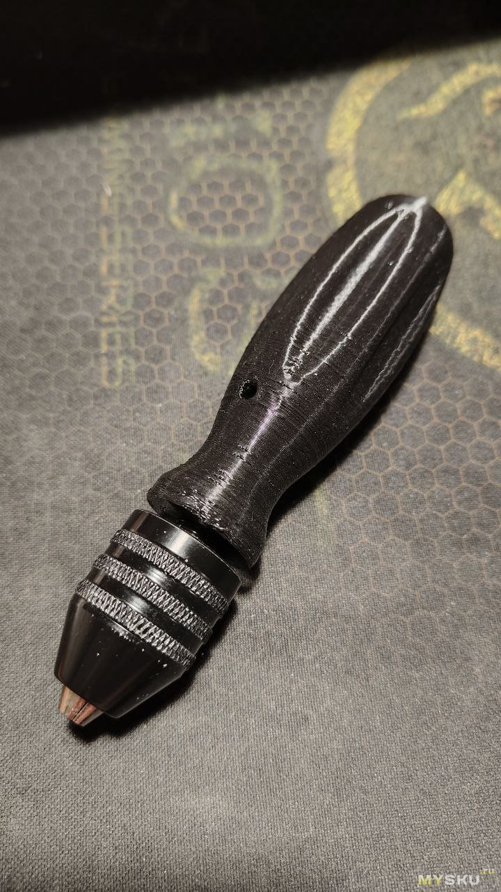 Ручка из TPU чтобы хват был лучше? Не знаю, наверное это имеет смысл только при больших нагрузках, а тут пластик. Не уверен, что между прижимами и зажимаемым инструментом (сверло) будет настолько хорошее сцепление, что нам потребуется прикладывать настолько большое усилие, что ручка будет прокручиваться в руке и надо будет это как-то компенсировать. А если у нас бита — то я полагаю, что при большом усилии просто разорвёт патрон/гайку или то, во что это зажато. Это всё таки не силовой инструмент.
