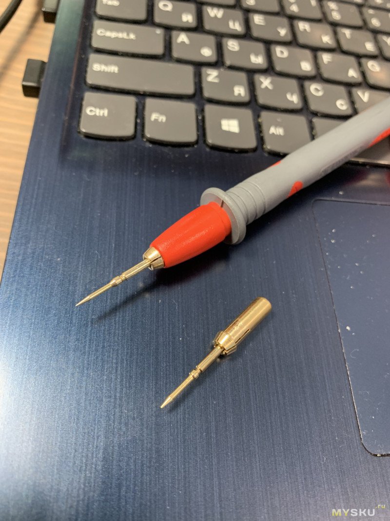 К сожалению щупы механик которые купил переделать так не получится — у них наконечники это штыри из нержавейки диаметром 2мм и длиной 100мм, в со стороны провода вплавленны латунные гильзы в которые вставляется этот стержень. и вот эту гильзу вытащить никак не получится — она и так частично наружу сбоку торчит…