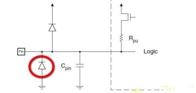 Дело в том, что у того MCU есть защитные диоды на входе каждого порта.