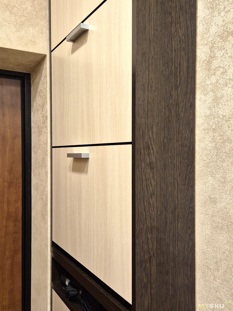 Так вышло, что основной шкаф в нашем коридоре был сделан на заказ очень высоким, 250 сантиметров, поэтому для обеспечения визуальной симметрии и практического удобства было принято решение заказать две обувницы УК-3 и поставить их друг на друга, чтобы получить общую высоту как раз 250 сантиметров и шесть отдельных полок для обуви. Забегая вперед, скажу, что в каждую такую полку ставится 2.5 пары обуви, то есть, общий объем обувницы составляет 12 полных пар обуви, а также 6 «полупар», которыми являются, например, пары тапочек. На практике этого вполне хватает для хранения большей части обуви на сезон.