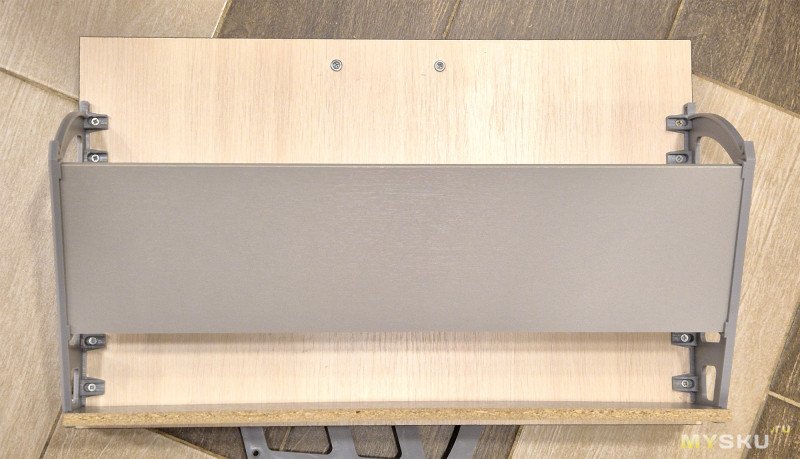 Однако, проанализировав конструкцию, я понял, что в нижней части полки есть свободное место, которое можно использовать если просто передвинуть серую ограничительную деревянную пластину (выполняющую роль дна) чуть правее по фото: