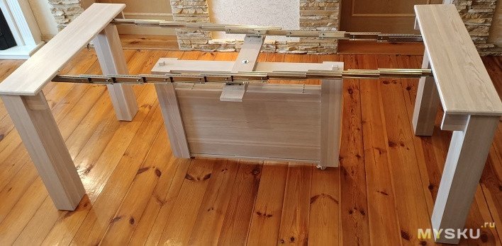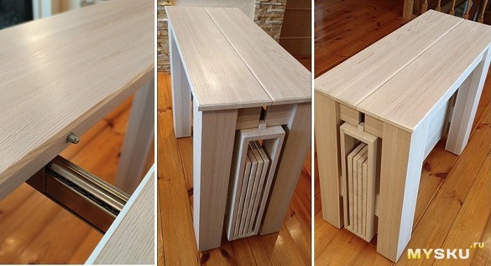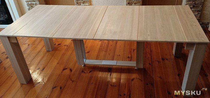 Ширина стола 95 см. Длину можно регулировать от 40 см до 2.2 метров, добавляя вставки столешницы. Вставки прочно стыкуются между собой металлическими шкантами по принципу «мама-папа»