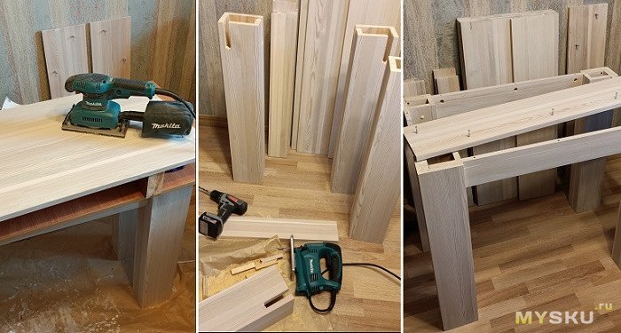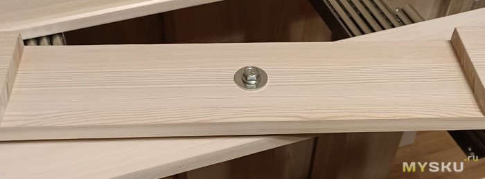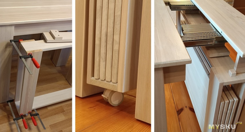 Дерево шлифовалось, окрашивалось. Крепилось все с помощью саморезов, скрытых стяжек и столярного ПВА-клея. Основной проблемой было подобрать болтовое соединение и закрепить поворотно-опорную пластину.