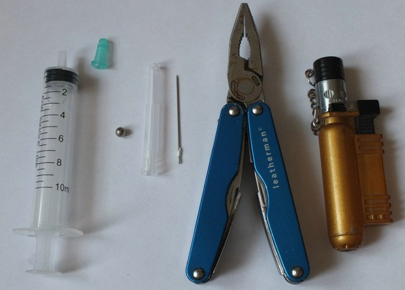 • Убрать металлическую часть иголки — зажать в плоскогубцах, провернуть (с усилием) пластиковое основание (которое насаживается на шприц).• Пластиковое основание оставить и заплавить дырявый кончик на зажигалке — будет затычка.