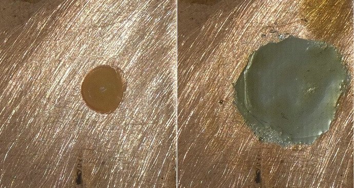 И наоборот: увеличение доли СКФ делает смесь более жиденькой, и (чисто теоретически) увеличивает активность. В предварительных опытах я так и делал: смешивал примерно 1:1 вазелиновый флюс (25%) и СКФ (50%). Флюсует примерно так же как рассмотренный в этой статье 2:1, но быстрее разбегается по фольге и консистенция показалась жидковата.
