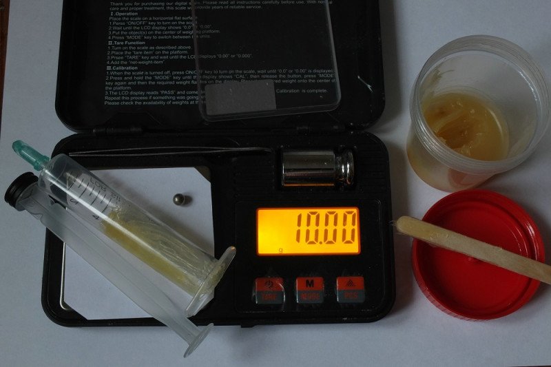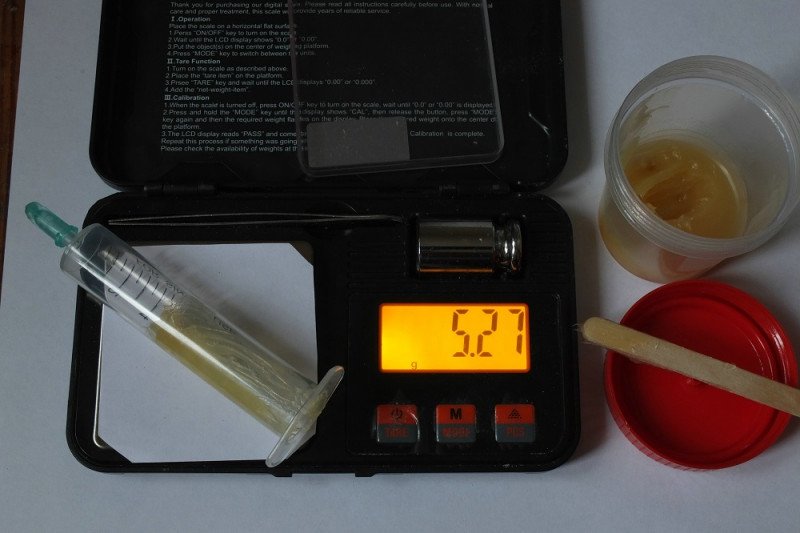 Я не буду утруждать читателя нудным описанием всех перипетий данной работы, приведу сразу конечный вариант (на сей момент). Он может показаться слишком сложным, но зато приводит к гарантированному результату — получается отличный флюс в шприце, который не знаю как назвать: «Солнышко», «Медовый»… Пусть пока будет «Докторский» — потому что в шприце + то, что доктор прописал… :)