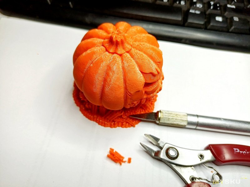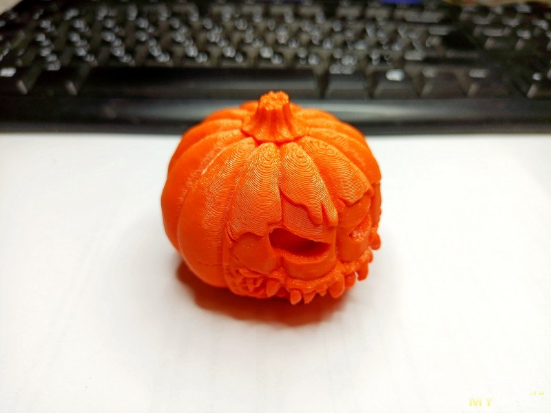 Первой вышла из печати злобная тыква. Фигурка оказалась довольно увесистой, с «поддержкой». Последнюю я «снял» с помощью скальпеля и кусачек. А мелкие заусеницы «ушли» после прогрева феном. Острые зубы я специально оплавил сильнее – чтобы ребенок не поранился. Цвет тыквы оранжевый, причем очень яркий и броский.