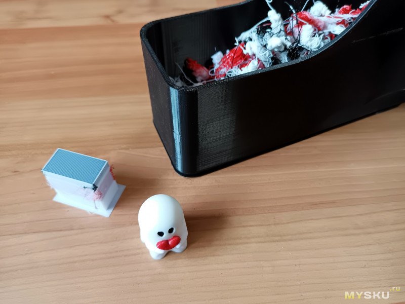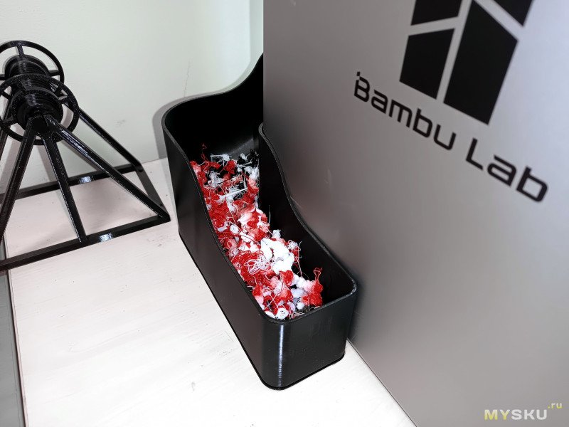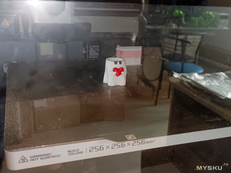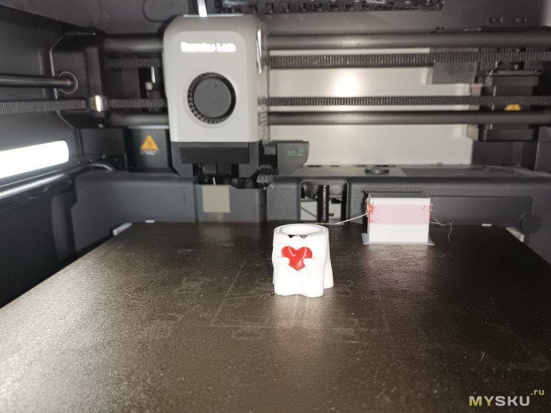 Фигурка привидения с сердцем печаталась более 10 часов. В отходы ушло большое количество пластика. Оказалось, сопло 3D-принтера Bambu Lab P1S при смене цвета на модели (красное сердце) уходит в зону «сброса», «выплевывает» остатки белого филамента, меняет филамент на красный, разогревает его, печатает тестовый слой, а уже после этого возвращается в рабочую зону и продолжает печать. И так слой за слоем.