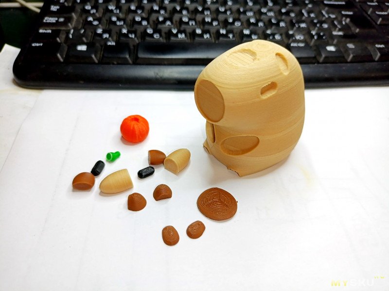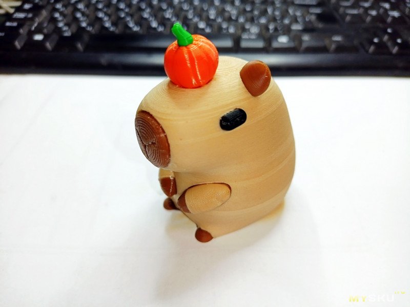 Вначале приклеил «ноги», затем «руки», а уже опосля – нос, глаза, уши, тыкву и хвостик растения. Первые две модели печатались PLA филаментом Jamg He. Капибара была напечатана Jamg He Wood с текстурой дерева. Говорят, при печати присутствует даже древесный запах.
