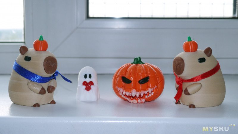 Тем более у внучки накануне Хэллоуина должен был «состояться» День рождения. Поэтому принял решение совместить оба события и заказать 3D-печать тематических фигурок – злобной тыквы, доброго привидения и капибары.
