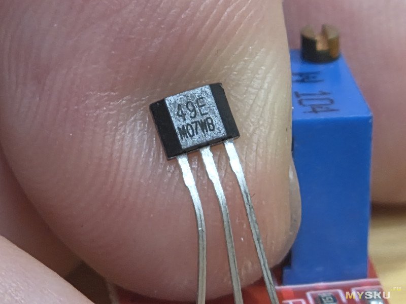 Несмотря на то, что датчик 49E биполярный, модуль реагирует только на одно направление магнитного поля, и как попало магнит клеить нельзя, нужно проверить полюс на который он реагирует и так клеить.