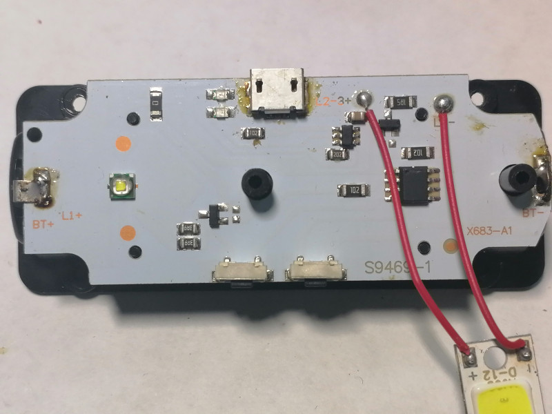 Электроника фонаря собрана на одной печатной плате с металлическим основанием: