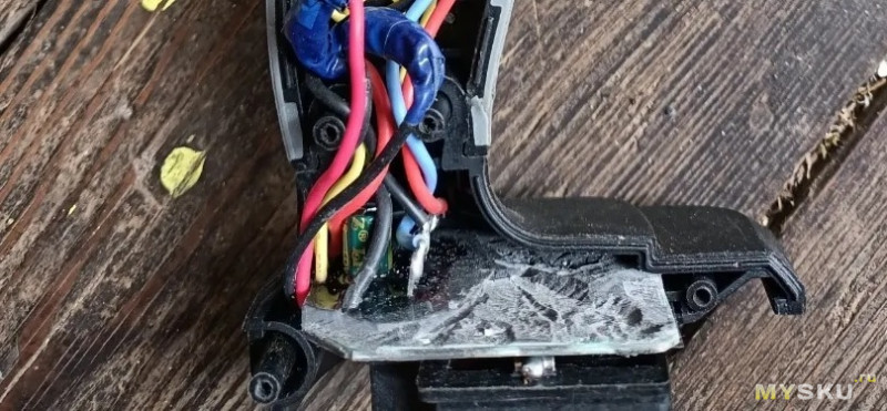 После проделывания основных манипуляций, включающих в себя отсоединение кнопки и отпайка клеммной колодки, у меня осталась на руках полусобранная пила, рабочий щеточный движок (пригодится для самоделок), и осознание того, что впихнуть контроллер бесщеточного движка некуда… Однако место, где он обычно должен располагаться оказалось на счастье съемной деталью.