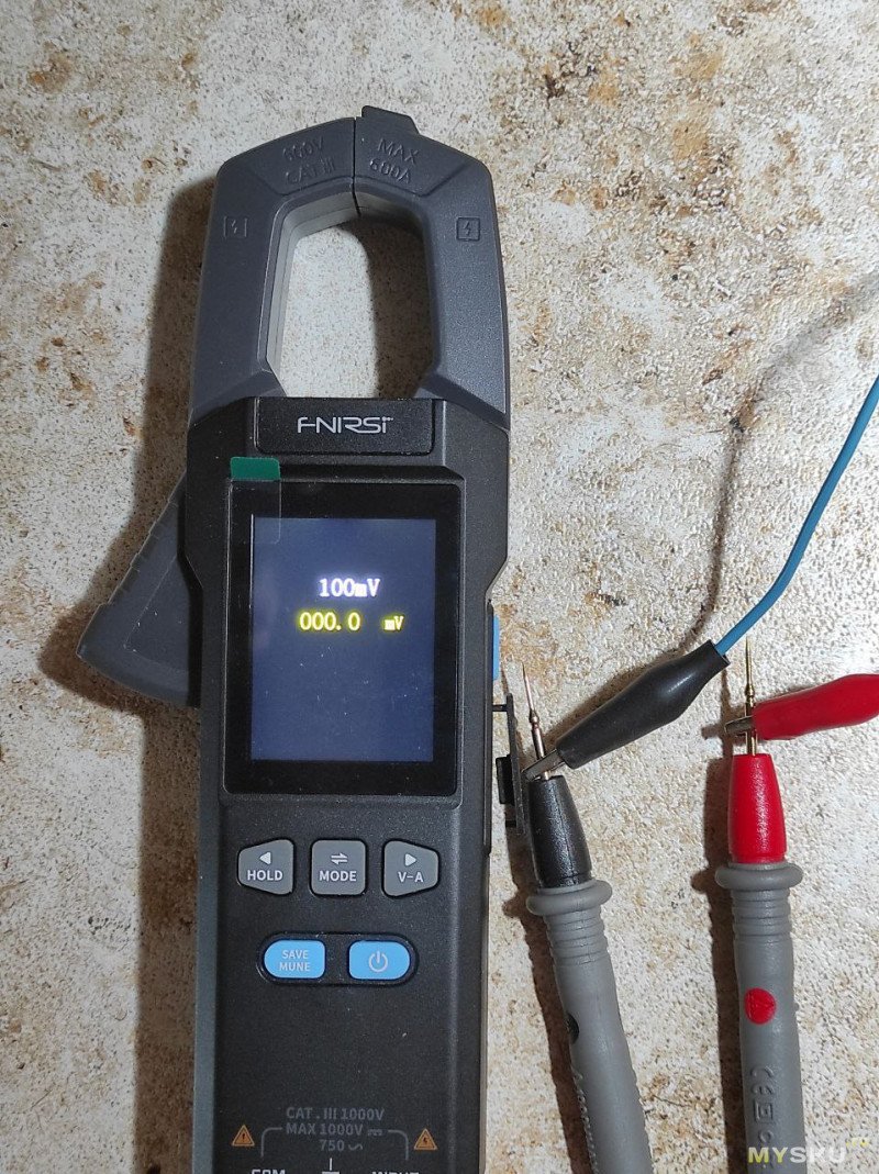 Если не хочется ждать пока пройдут все эти напряжения, то можно перейти на следующий диапазон кнопкой SAVE. Это калибровка милливольт. Токовые клещи просят дать на щупы 100мВ.