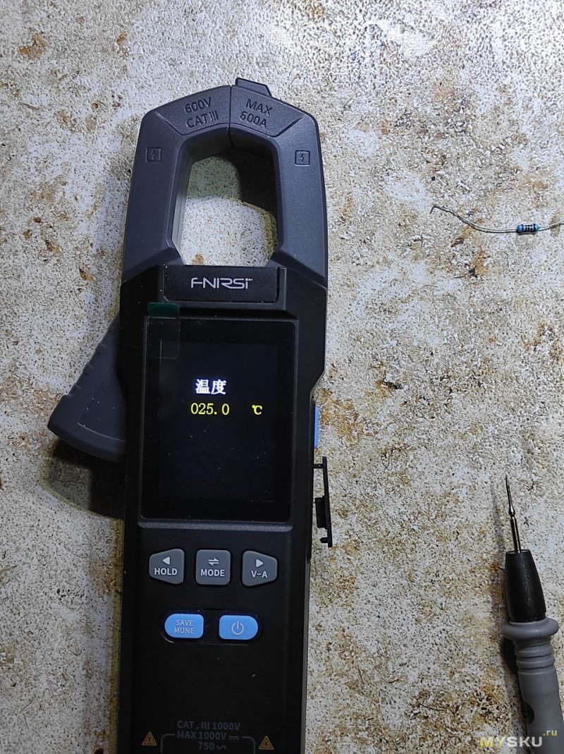 После успешной калибровки можно выключить клещи долгим нажатием на кнопку питания или можно продолжить калибровку, нажав MODE и перейти в следующий диапазон. Следующий диапазон — температура. Показывает температуру и ее можно скорректировать стрелками влево-вправо. MODE сохраняет скорректированное значение, если нужно. Или можно идти дальше, нажав кнопку SAVE.